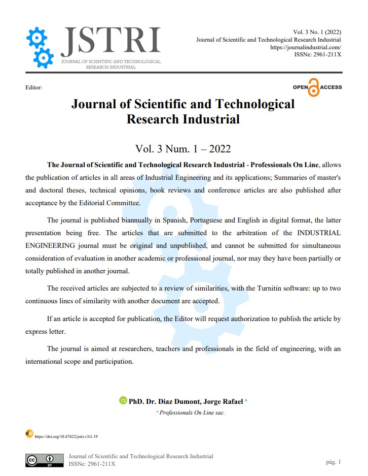 The Journal of Scientific and Technological Research Industrial - Professionals On Line, allows the publication of articles in all areas of Industrial Engineering and its applications; Summaries of master's and doctoral theses, technical opinions, book reviews and conference articles are also published after acceptance by the Editorial Committee.